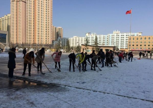 天气再寒冷,也阻挡不了同学们的热情。同学们挥舞着铁锹和笤帚,相互配合,你铲我扫,一点点地将积雪和冰层铲起集中堆放。激情驱散寒冷、汗水消融冰雪,经过一个小时的奋战,安亭广场东侧大部分积雪被清扫干净,方便了广大师生的出行,同时也是对入党积极分子的一次义务劳动教育。