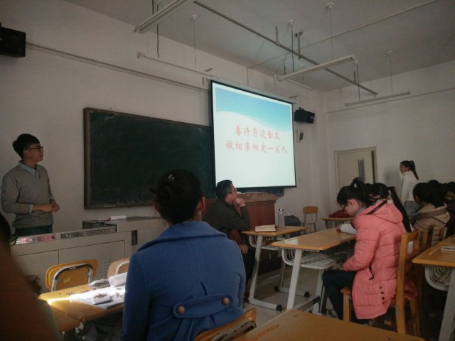 班会在轻松愉悦的氛围中进行,班会围绕“防火、防盗、防舍友”展开,尤其是在网络上大量流传的“防舍友”一词,使同学们对处理宿舍关系的问题讨论异常热烈。大量的图文通过ppt的形式展现出来,使同学们对防火、防盗、处理宿舍关系三个方面的内容有了深刻理解。班会接近尾声时,凌毅书记对班会做出点评并对同学们提出要求和希冀,凌书记指出,作为中文专业的员工一定要扎实专业基础、明确未来就业方向、做好自己的职业规划,将来有一个良好的发展。最后,班会在激情高昂的班歌《崛起》中结束。