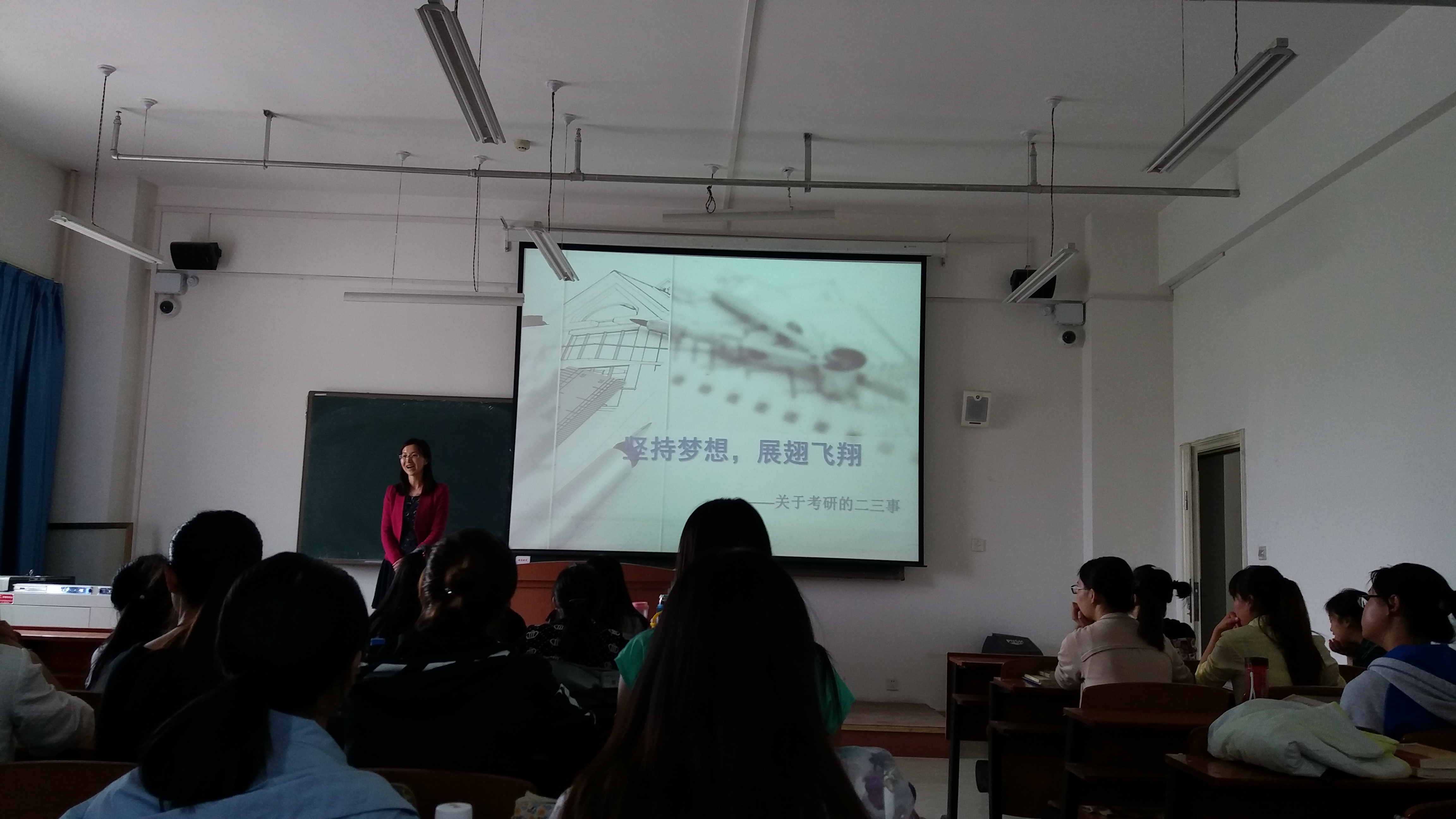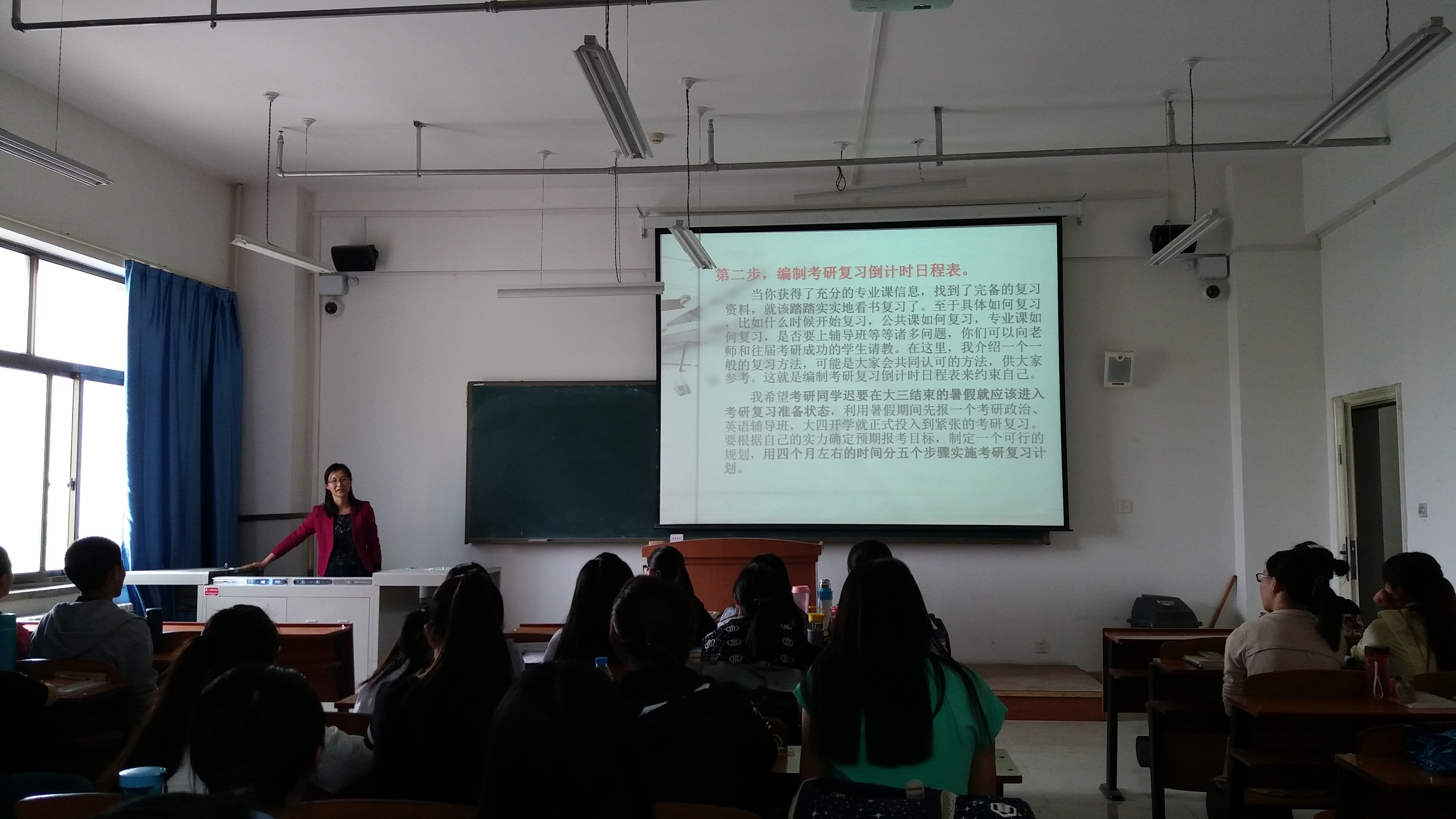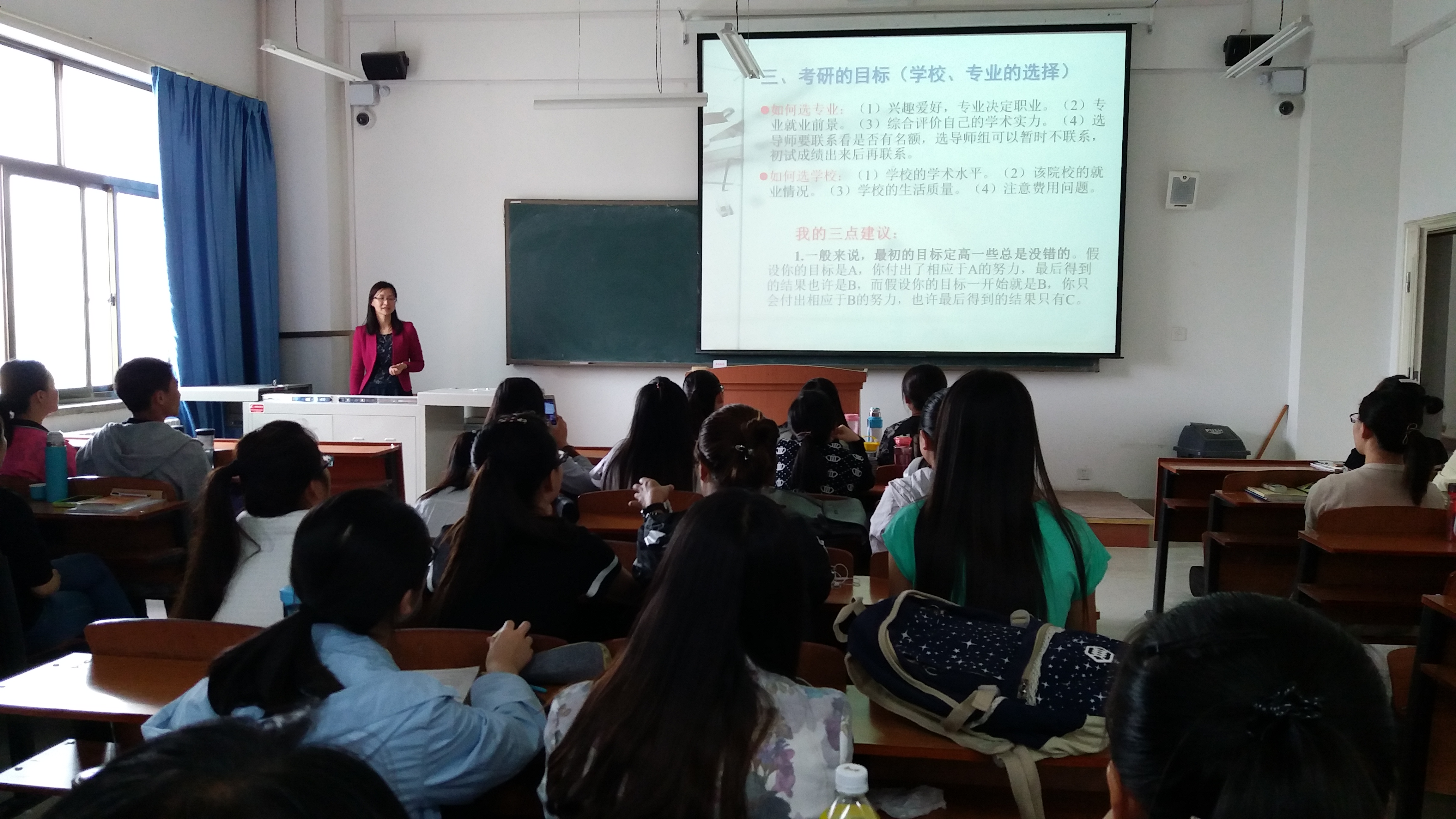 金艳霞博士的讲座在轻松、愉快的气氛中进行,她春风化雨般的亲和力,使同学们不知不觉受到了感染,得到了启迪,获得了丰富的考研信息和知识。本次讲座取得了良好的效果,讲座在同学们的热烈掌声中圆满结束。
