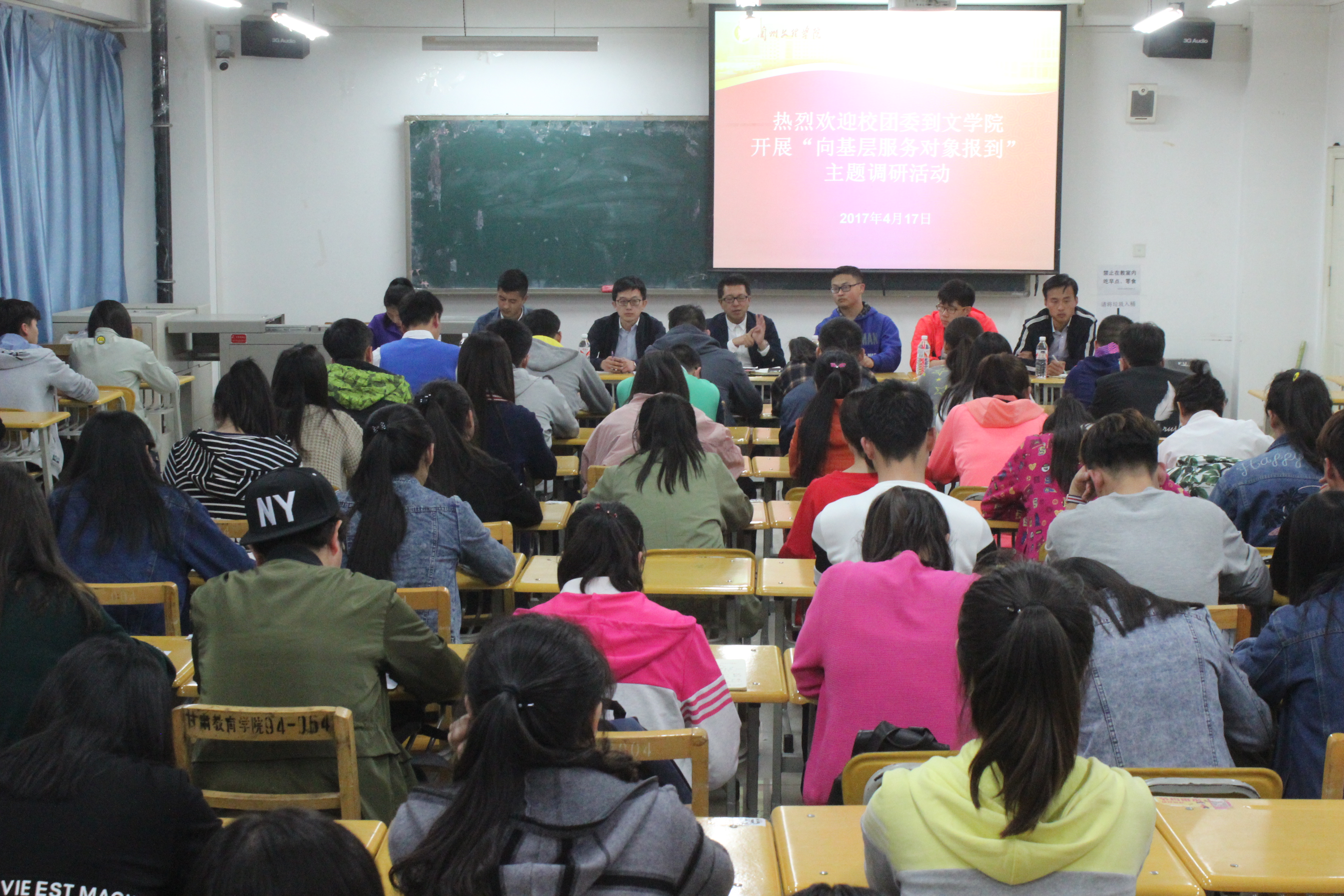 为进一步贯彻落实《高校共青团改革实施方案》的精神,落实团省委、校团委关于开展“学习近平总书记讲话,做合格共青团员”教育实践的相关文件精神(以下简称“一学一做”),学习贯彻习近平总书记在中央党的群团工作会议上的重要讲话精神,切实做好思想引领、素质拓展、权益服务和组织提升工作,4月17日晚7点,校团委孙亮书记带领校员工会主席团成员到公司开展“学习近平总书记讲话 做合格共青团员”主题调研暨“1+100”团干部直接联系青年工作,学院分团委员工会全体干部,各班团支书、组织委员、宣传委员,15级汉语言文学1班作为孙亮书记“1+100”团干部联系青年的班级的全体共青团员参加了此次调研活动,活动由开云分团委副书记孟煜杰老师主持。