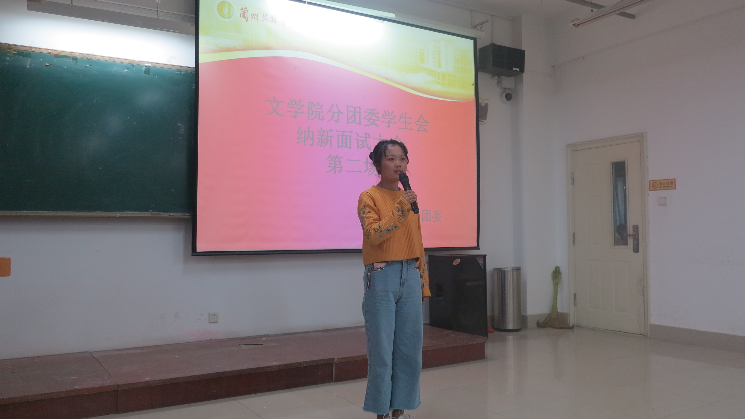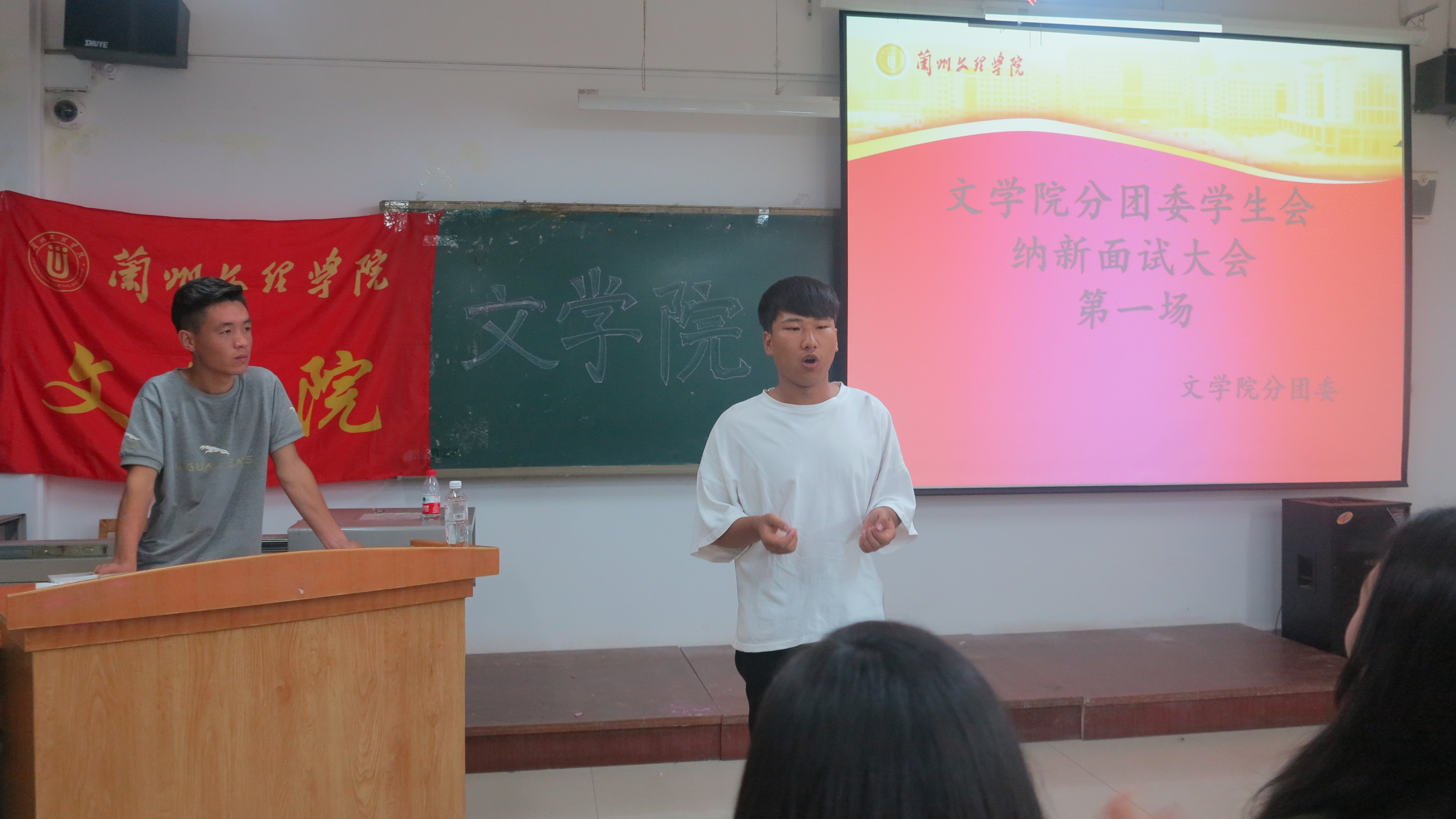 在主持人念到姓名时,新生上台递交申请书,面向全部同学进行自我介绍和才艺展示,并认真回答部长的问题,由部长副部长作为主考官决定是否吸纳其成为新干事。