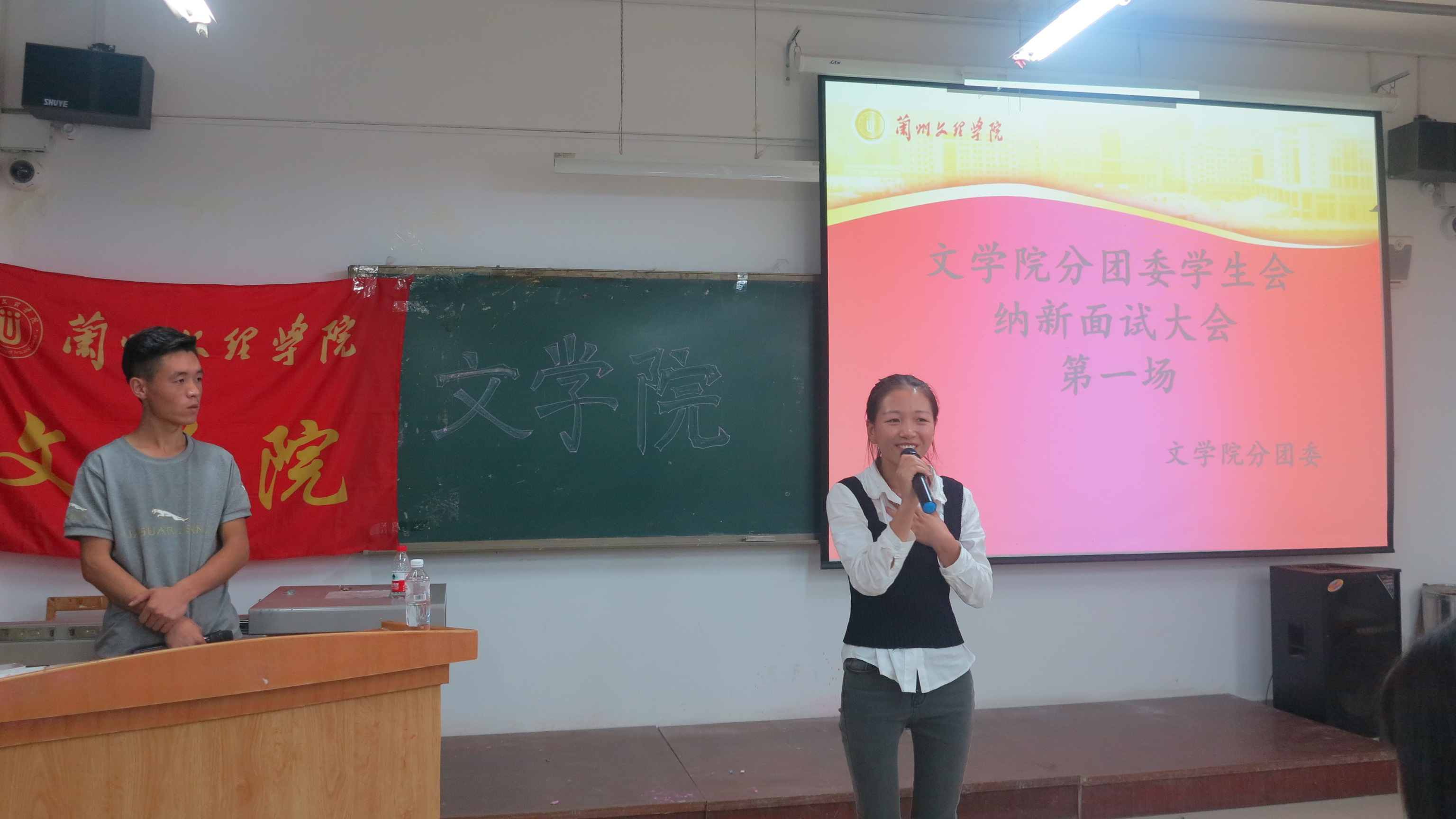 在主持人念到姓名时,新生上台递交申请书,面向全部同学进行自我介绍和才艺展示,并认真回答部长的问题,由部长副部长作为主考官决定是否吸纳其成为新干事。