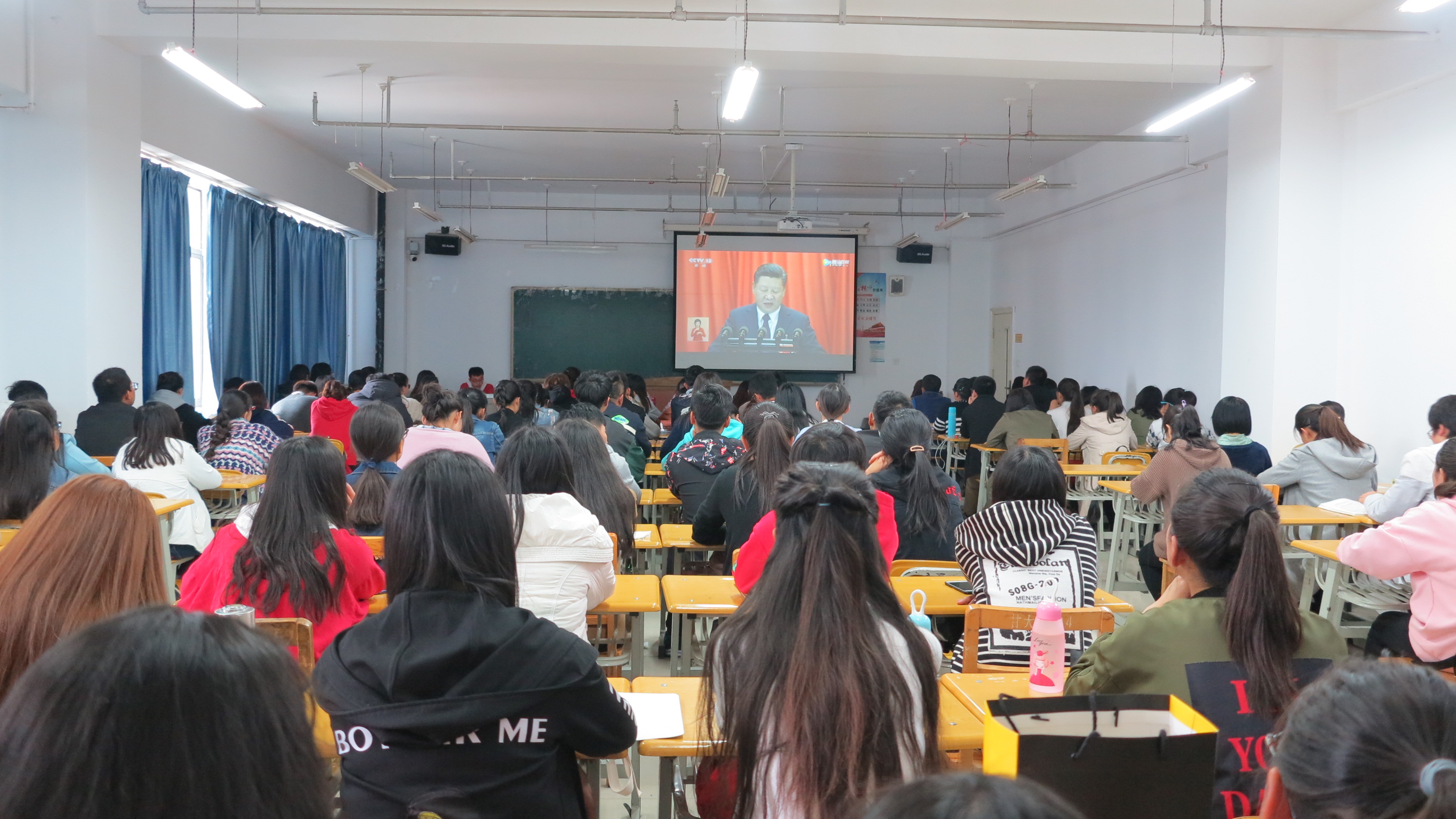 随后同学们一同观看了习近平总书记代表十八届中央委员会向大会作的题为《决胜全面建成小康社会 夺取新时代中国特色社会主义伟大胜利》的报告。