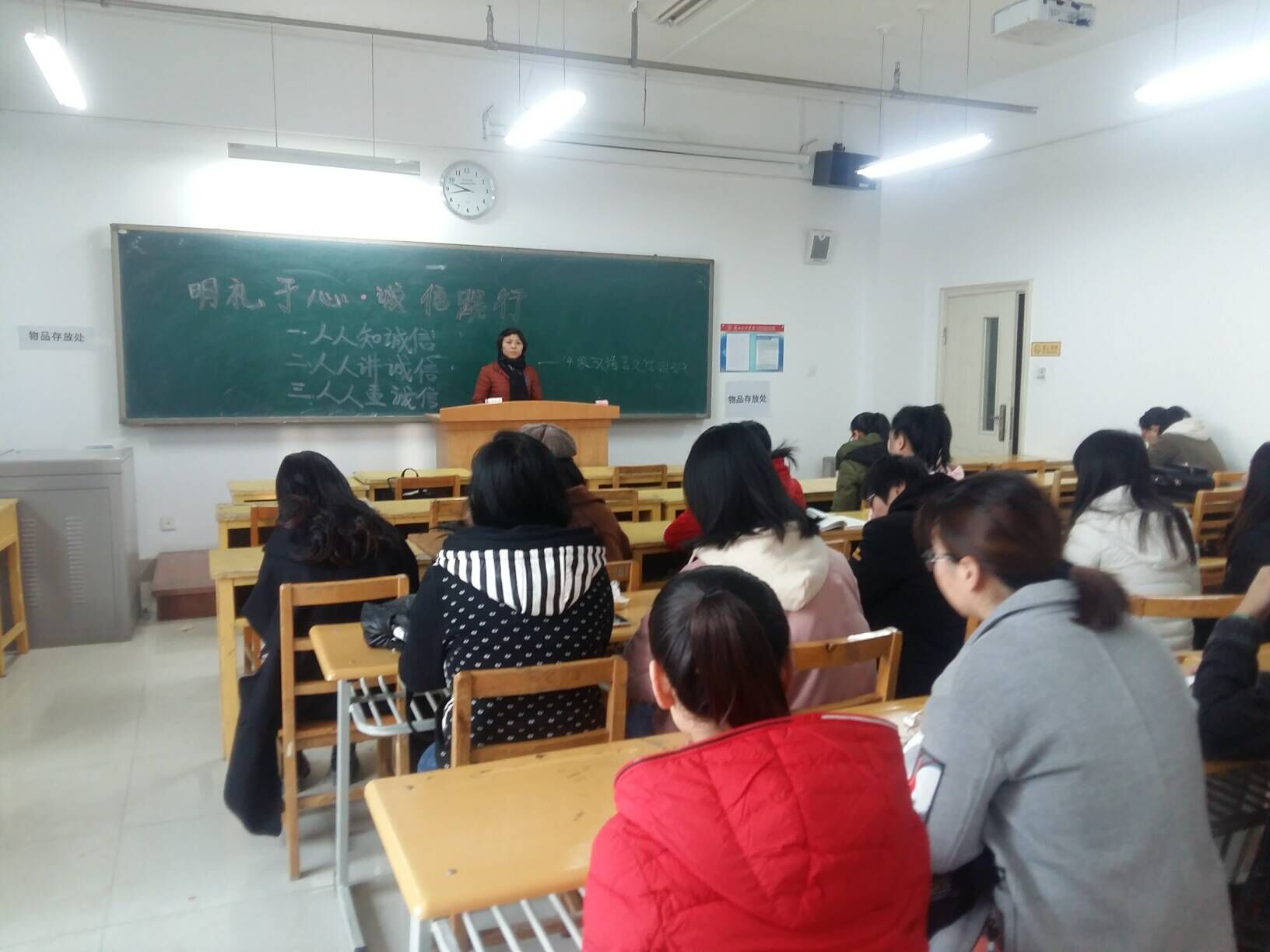 在主题班会上,各班班主任都提到,考试作弊践踏诚信理念,助长了不劳而获、投机取巧的心理作弊一方面会引发不正当竞争的产生,干扰良好学风的形成。另一方面,就员工自身发展来说,考试作弊将会成为员工生涯中最大的污点。班主任对同学们提出了要求,要求全班同学必须做到认真复习备考、诚信考试、杜绝考试作弊。同学们认真聆听了班主任讲话,并且积极发言,承诺会在考试中恪守明礼诚信的准则,用自己的努力去取得优异的成绩。在班会的最后同学们在诚信考试的承诺书上光荣的签上了自己的名字。