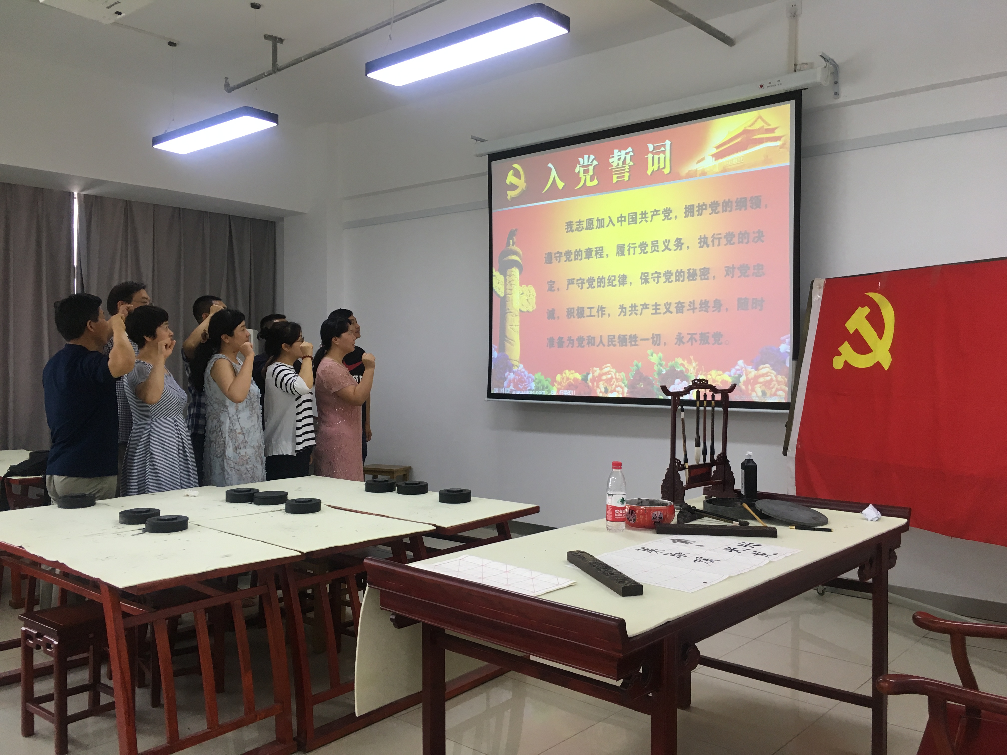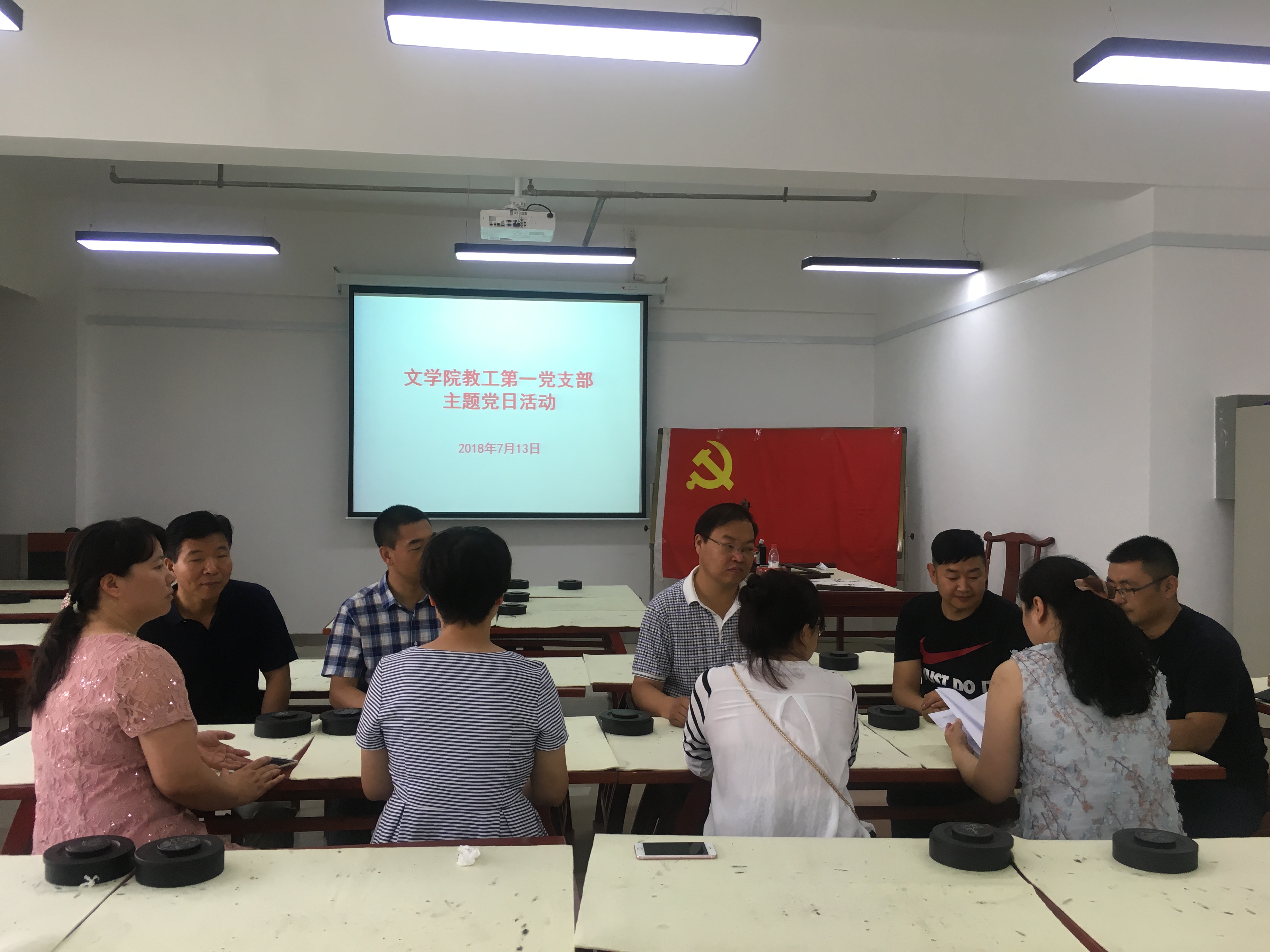 为深入学习贯彻习近平新时代中国特色社会主义思想和党的十九大精神,纪念中国共产党成立97周年,根据学校的要求和公司党总支的安排部署,公司教工第一党支部于7月13日在学院书法教室组织召开了庆祝建党97周年主题党日活动。活动由支部书记王德峰主持。