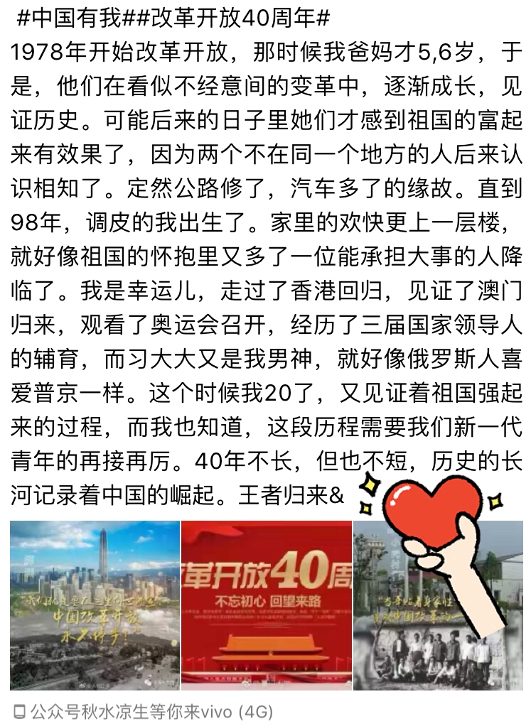 改革开放40周年,祖国发生的翻天覆地的变化令国人感到骄傲。40年风雨,40年辉煌,改革开放是当今中国的强国之路,是中国发展进步的活力源泉。我们庆幸生活在这样一个不断壮大不断前进的祖国。我们要坚定中国特色社会主义道路自信、理论自信、制度自信、文化自信,为实现中华民族伟大复兴继续前进。
