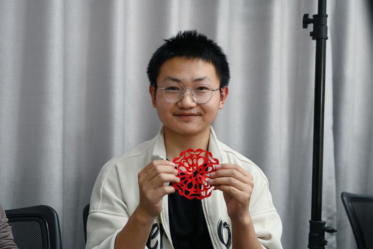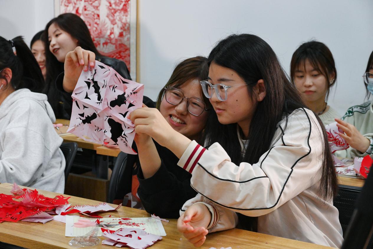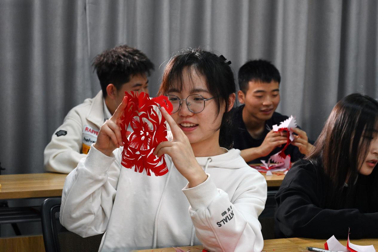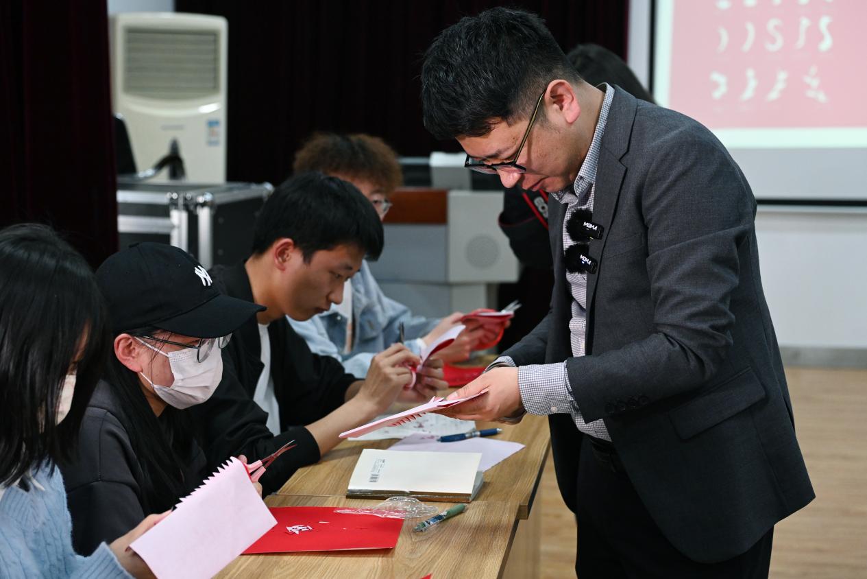 裴天鹏给同学们现场展示剪纸艺术