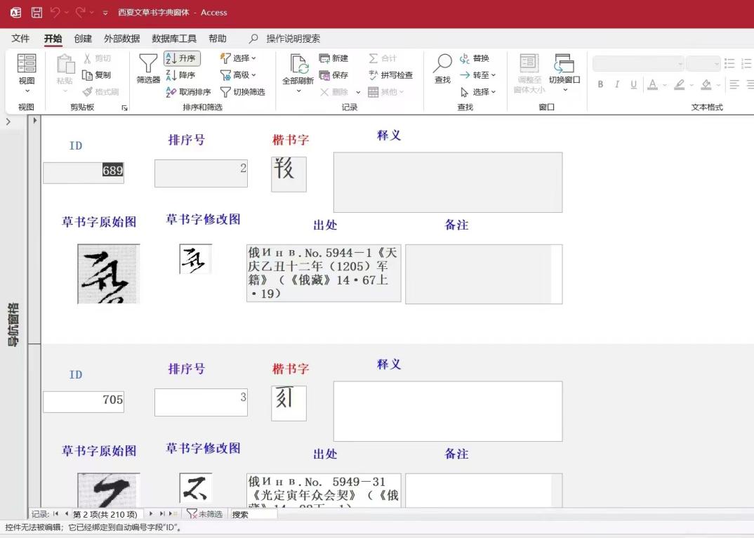 《西夏文草书整理研究与数字化推广》是赵天英老师首次系统整理西夏文草书的科研项目,在以往研究基础上将其数字化推广,对西夏文草书文献进行了梳理,为每条数据提供了西夏文草书的原始图、净化图、楷书字、注音、释义以及出处等详细信息。通过对这些数据的收集和整理最大限度地展示所选西夏字的各种草书形态,为进一步研究和解读西夏文草书提供基础。