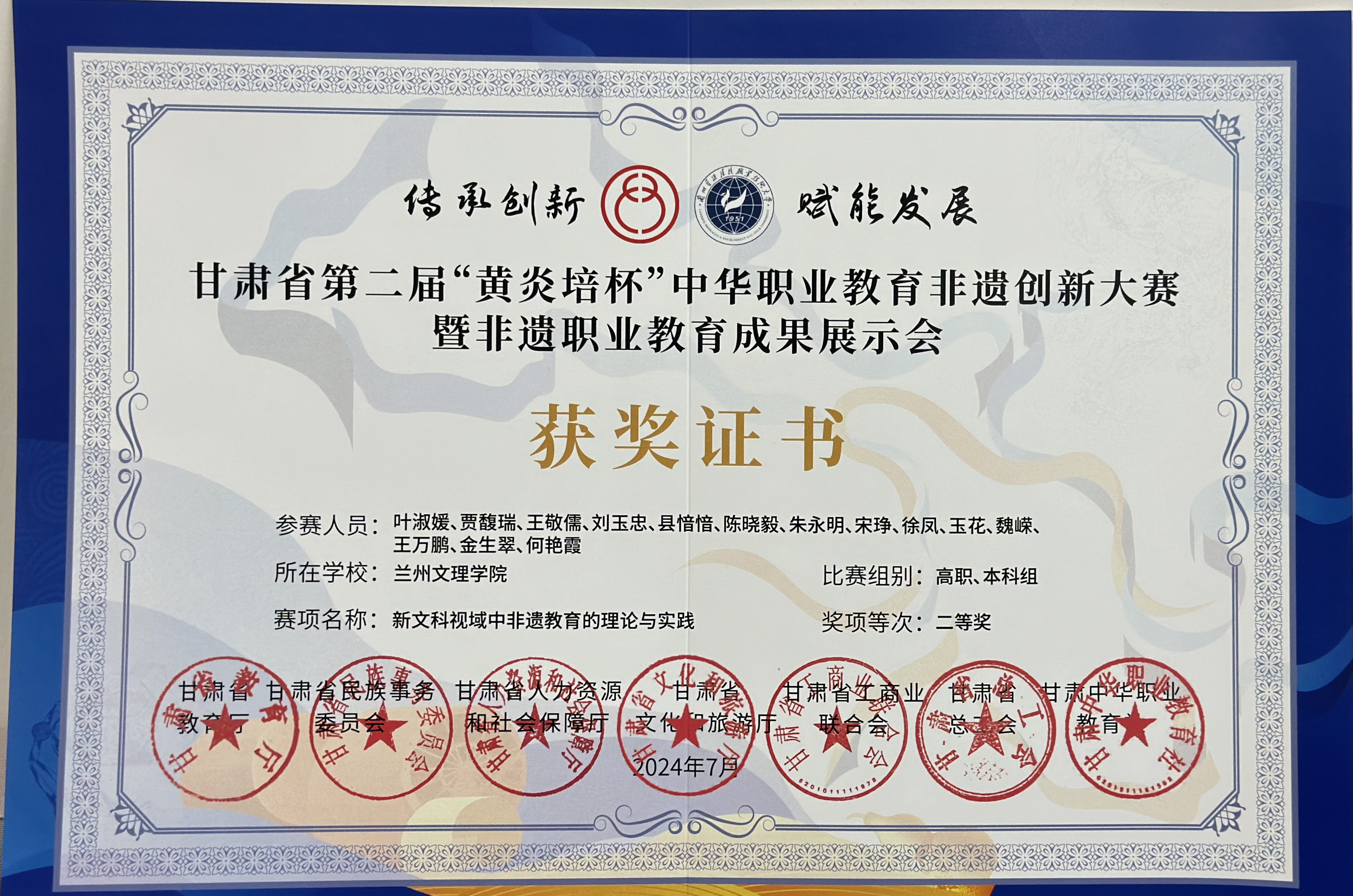 公司“新文科视域中非遗教育的理论与实践”教学成果获得甘肃省第二届“黄炎培杯”中华职业教育非遗创新大赛暨非遗职业教育成果二等奖(高职、本科组),该项评选结果于2024年9月中下旬全部揭晓。