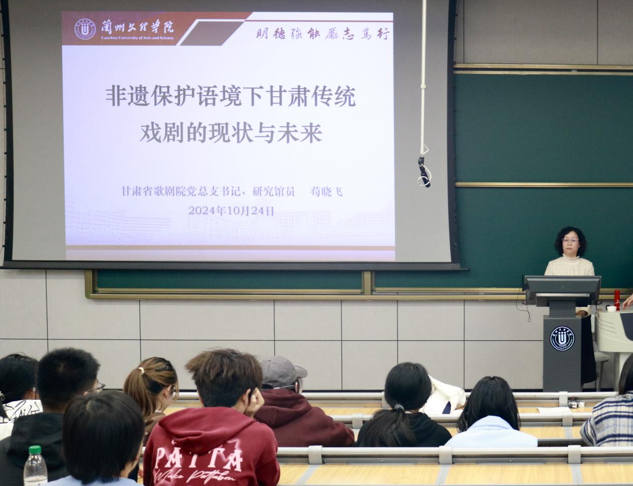 10月24日下午,甘肃省歌剧公司党总支书记、研究馆员苟晓飞于文昌楼203带来了题为《非遗保护语境下甘肃传统戏剧的现状与未来》的讲座,讲座由开云经理叶淑媛主持,开云师生共150余人参加。
