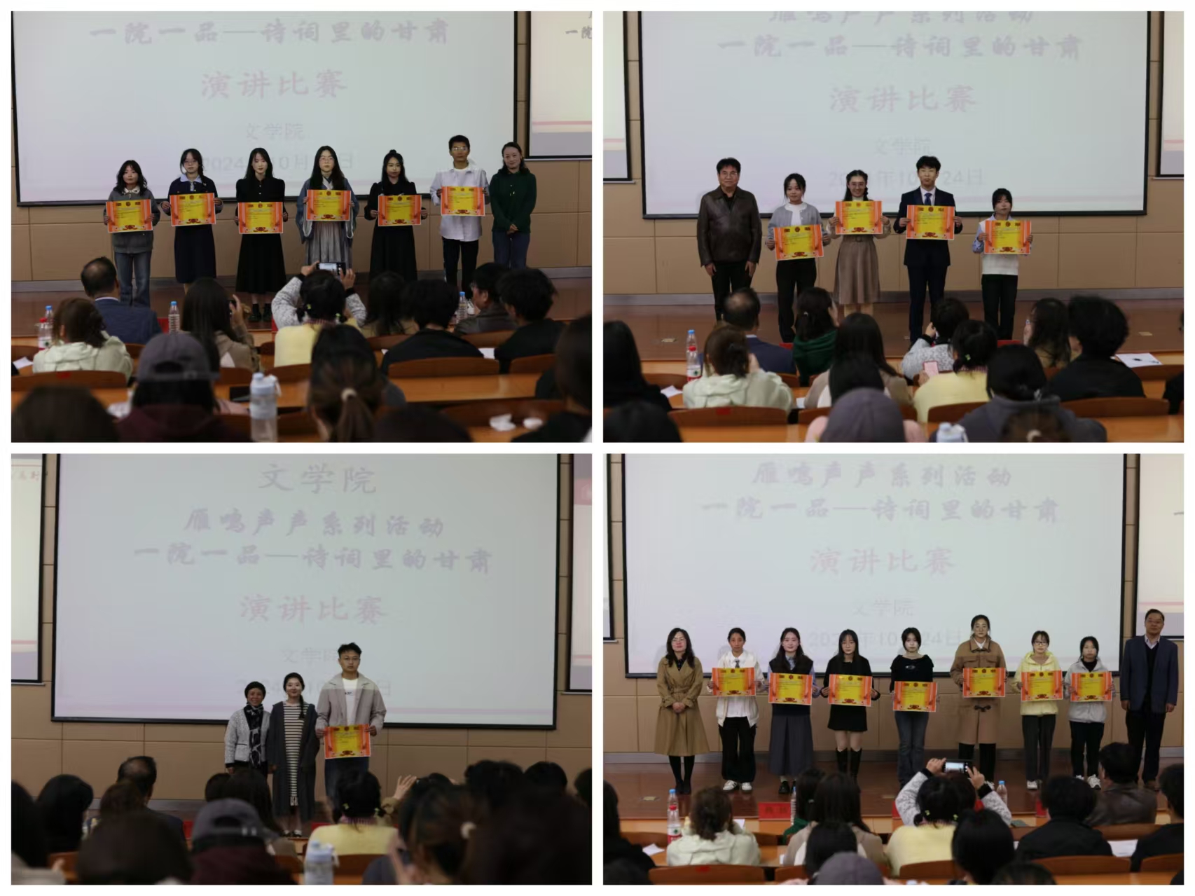 最终,24级汉语言文学专升本1班《聆听诗词,邂逅甘肃》、24级汉语言文学专升本2班《甘肃,诗画中的壮丽山河》、24级汉语言文学2班《品诗词之美,悟甘肃之韵》演讲荣获佳绩。