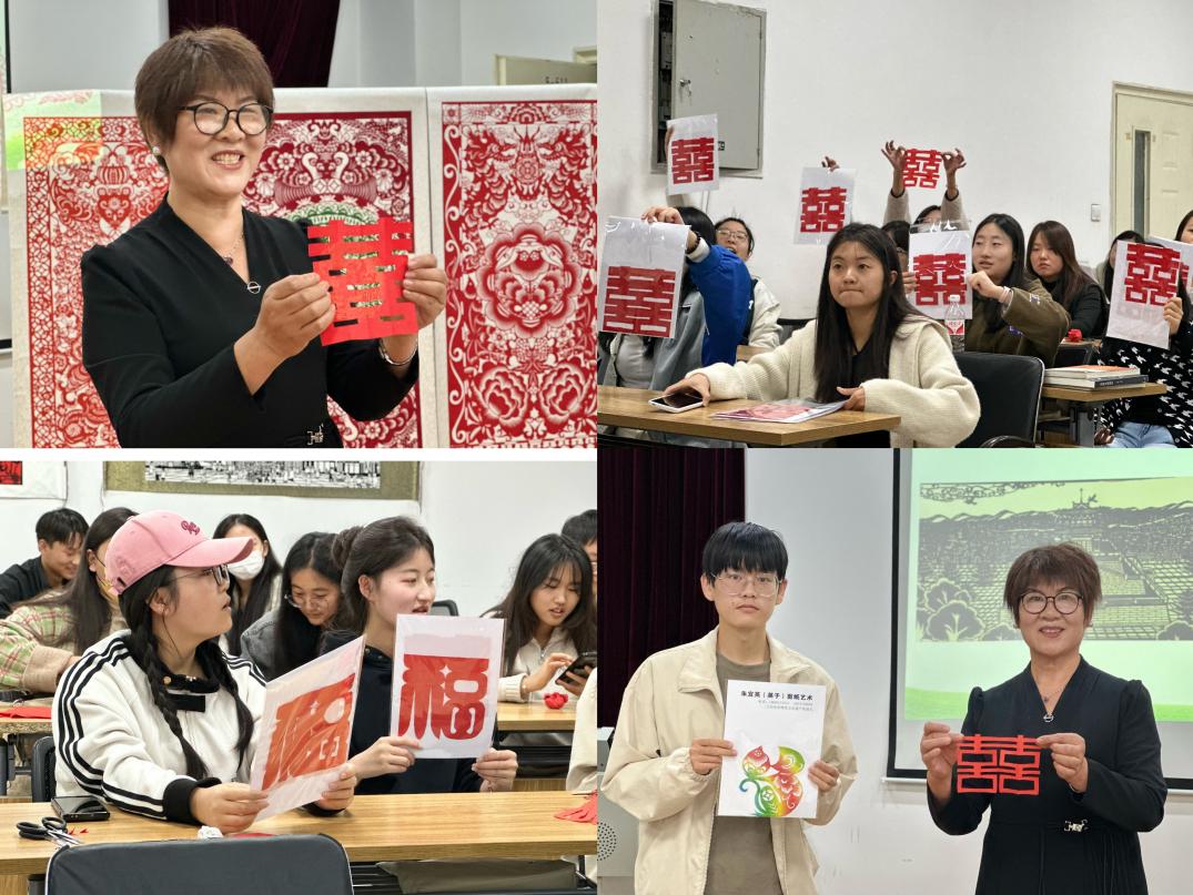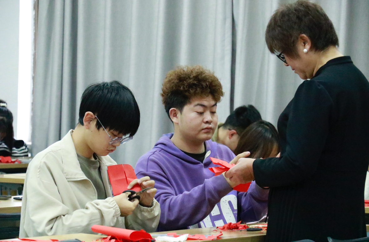 课上,朱宜英先向非遗专业的同学们介绍了她的创作历程与创作经验。谈及对剪纸的兴趣最初源于山东滕州老家生活环境的熏陶。参加工作后,因为职工文化活动以及同事亲朋的婚礼庆典,她重拾旧梦,开始创作剪纸作品。近年来,朱宜英积极参加各种剪纸艺术研修班,创作了大量人、兽、花、鸟等题材的优秀作品。随后朱宜英对同学们展开了具体的剪纸指导,教习了双“喜”字和“福”字的剪法,并耐心指导同学们完成。