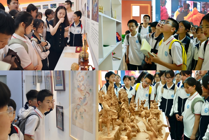 活动伊始,研学团走进非遗知识馆,在讲解员专业讲解下,师生们近距离观赏香包、皮影、剪纸等甘肃特色非遗展品,感受传统文化的独特魅力。