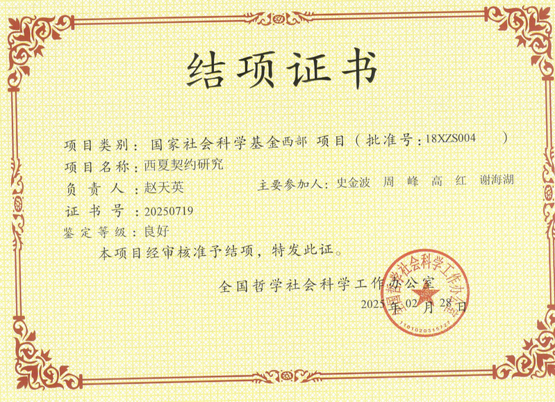 开云赵天英老师主持的国家社科基金项目《西夏契约研究》顺利结项,获评“良好”等级。该项目前期产出4篇论文(含2篇C刊),最终成果达60万字。